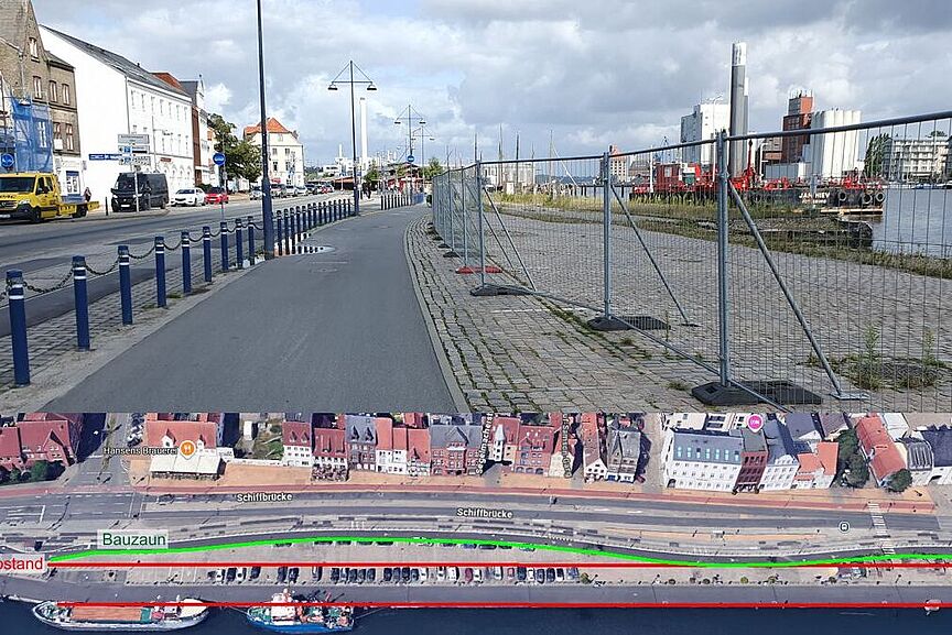 Die Antwort der Stadt auf unsere diesbezügliche Anfrage war wenig plausibel. Entweder der Radweg unterschreitet den minimalen Sicherheitsabstand über weite Teile, was ein unzulässiges Risiko darstellen würde oder der Bauzaun könnte parallel zur Kaikante verlaufen.
